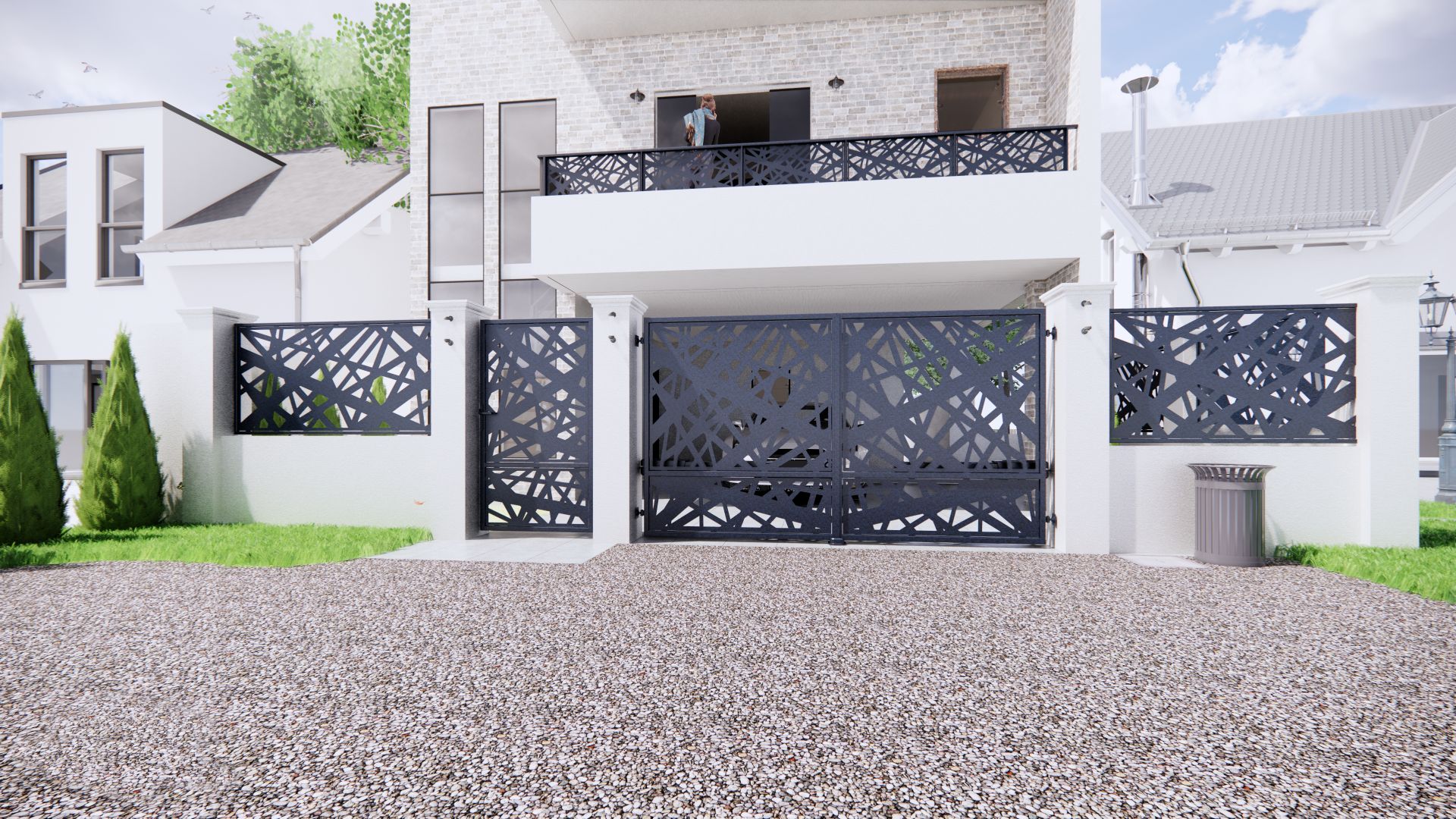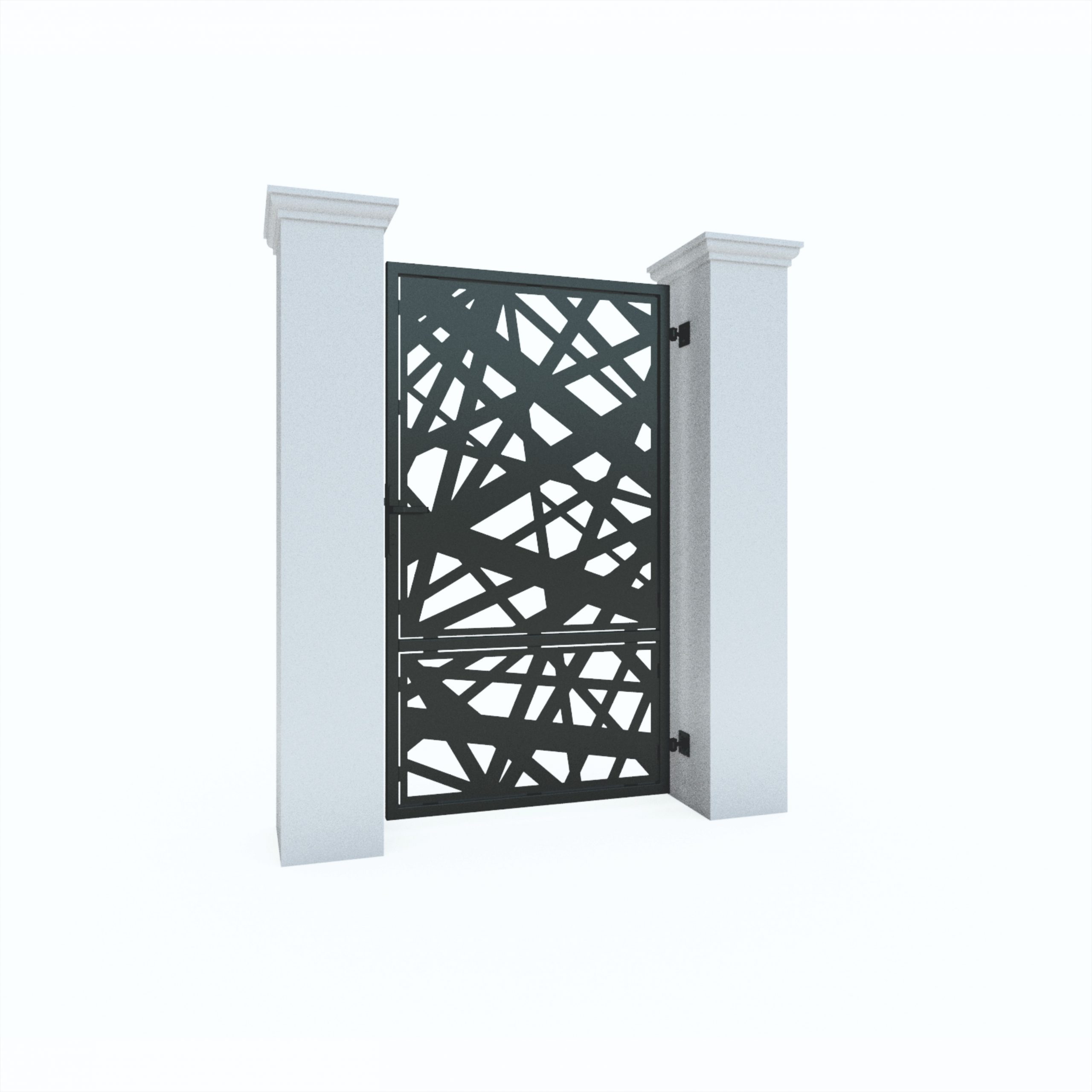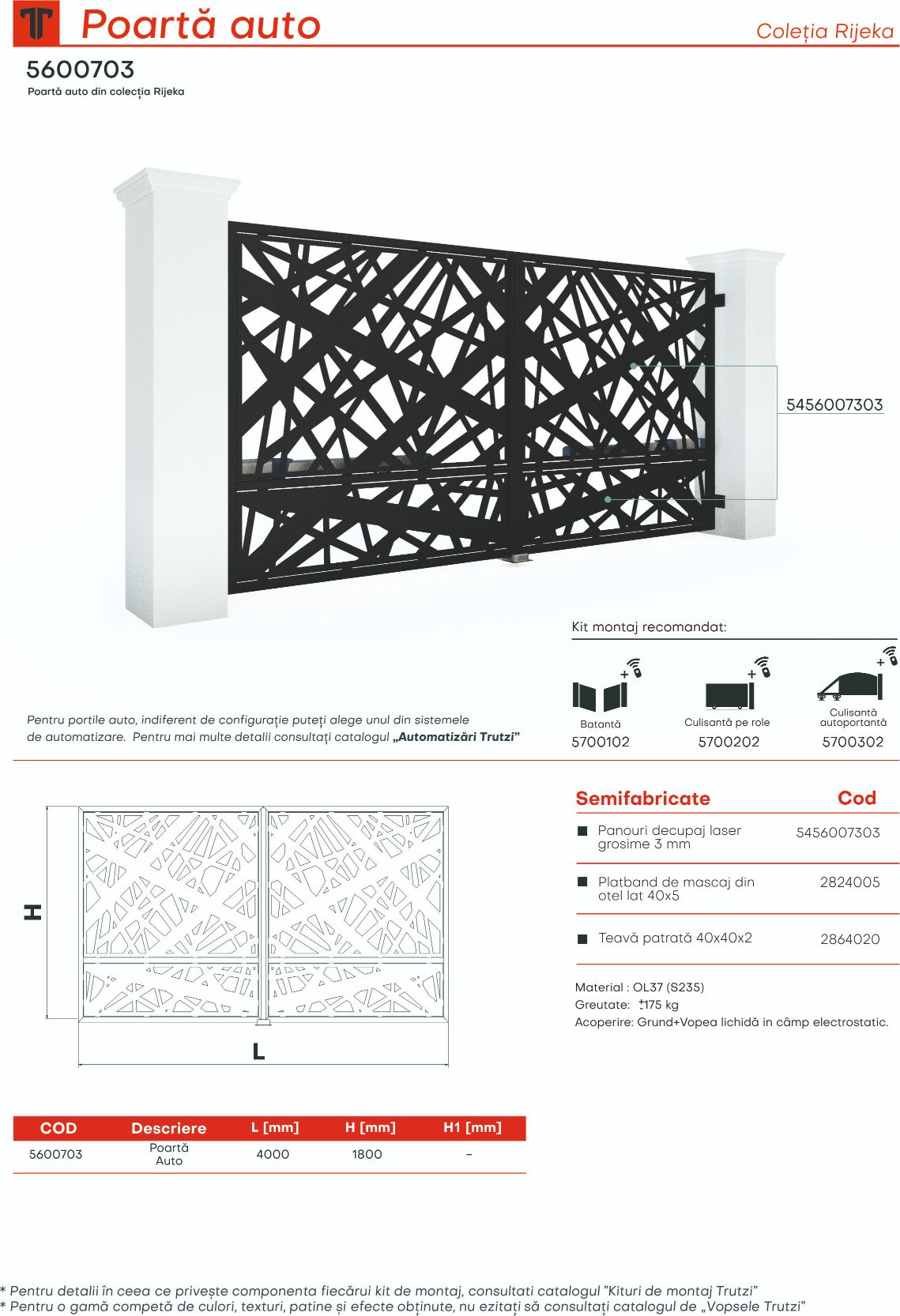 Set porti compus din 2 porti auto cu lungime totala 3500 mm si inaltime 2000 mm si poarta mica 1000x2000mm, confectionat din tabla debitata laser cu grosimea de 3mm, rama 40x40x2 mm. Vopsit in camp electrostatic.